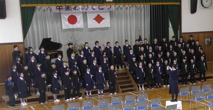 6年生70人は、小学校6カ年の課程を修了し、卒業証書を授与されました。これからの活躍をお祈りしています。