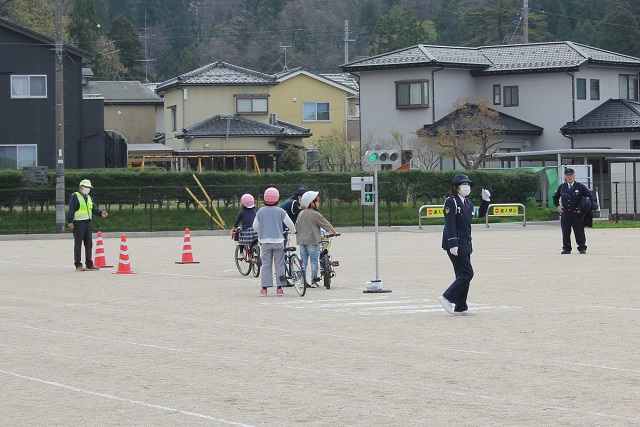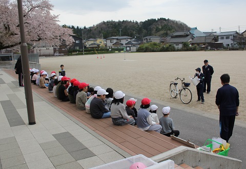 1年生と4年生を対象に、交通安全教室を行いました。駐在さんと交通安全協会の方々に、4年生は自転車の乗り方、1年生は道路の歩き方や横断の仕方について、教えていただきました。