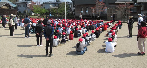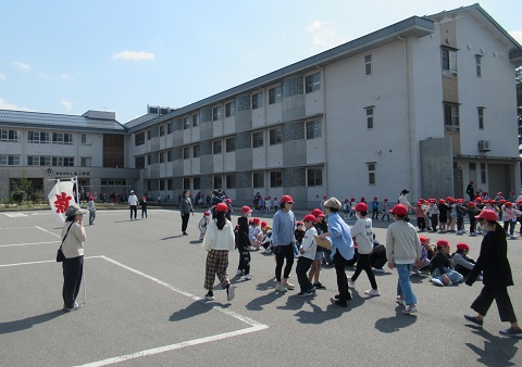 今年度の最初の、授業中の火災を想定した避難訓練を行いました。頭を守るために帽子をかぶり、マスクやハンカチで口をおおい、「おはしも」(おさない、はしらない、しゃべらない、もどらない)の避難時のきまりを守りながら、安全に屋外に避難することができました。
