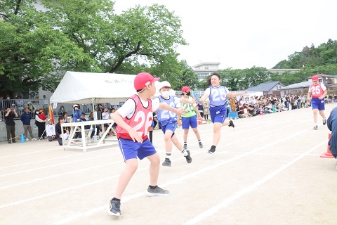 各学年ごとの徒競走と、玉入れ(1、2年)・ロープ引き(3、4年)・四色対抗リレー(5、6年)の団体競技で競い合いました。運動会の前半は、白組がリードを保ちながら、赤組が追いかける展開で、大変盛り上がりました。