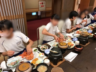 入浴をすませ、さあ、夕食です。ホテルの方に、カニの食べ方を伝授していただいたら、みんな夢中でカニと格闘
