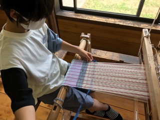 いろいろな色や模様をした布切れを選んで、機織り機で織っていきます。1センチ織るにも、時間がかかります。