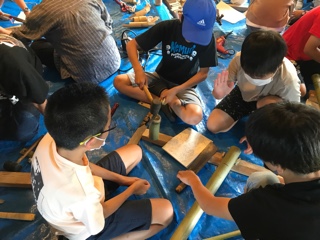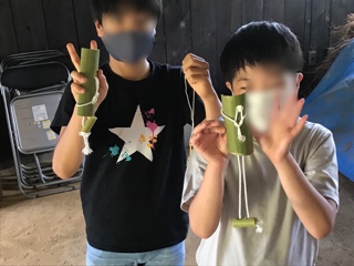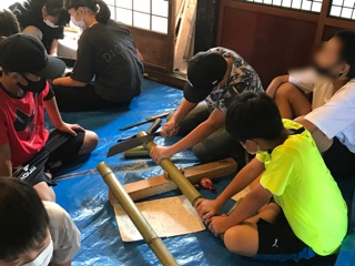 竹細工は、ノコギリやナタ、ドリルなどの道具を使って、竹を加工して、けん玉や知恵の輪、ブンブ