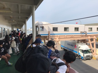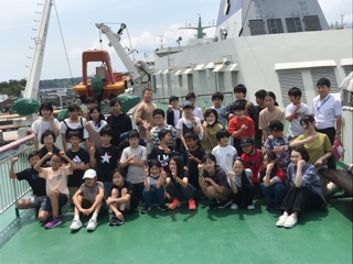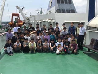 二日間の活動を無事に終え、全員元気にフェリーに乗船し、さっき出港したところです。甲板で記念写真