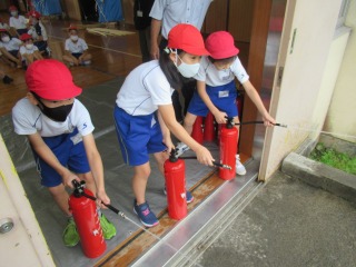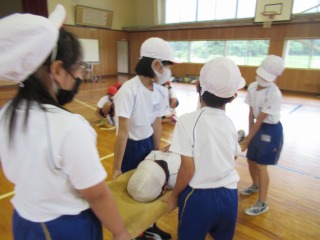 4年生が「あかたにの家」へ防災教室に行ってきました。毛布で手作り担架を体験したり,水消火器で火消しの模擬体験をしたり,いざというとき,自分たちに出来ることを考えながら教室に参加しました。新聞紙でスリッパ作りも体験しました。新聞紙のスリッパは,さっと家族分作れると,とても役に立ちそうです。