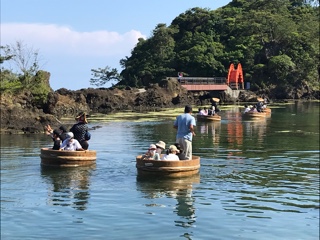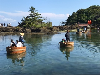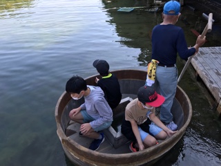 矢島体験交流館で、たらい舟に乗りました。最初は、船頭さんに漕いでもらいましたが、途中からは自分た