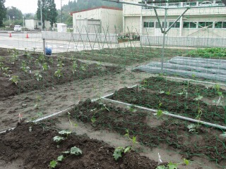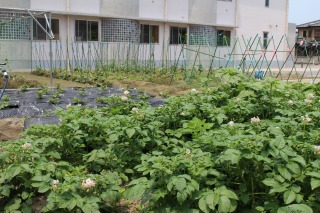 学校前の畑に各学年が育てる作物が植えられました。じゃがいもやさつまいも,ヘチマなどがにぎやかに並んでいます。子どもたちは,毎朝,登校してくると真っ先に水やりする姿が見られます。早く大きくなってね!