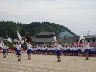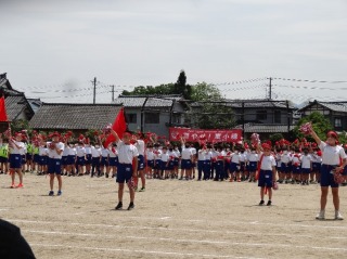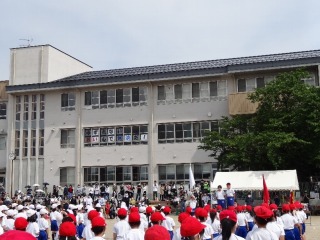 東小学校第4回の運動会が、5月24日(月)に行われました。五月晴れの下、「ゆずれない熱い心で対決だ」をスローガンに、赤組も白組も競技に応援に「本気」で頑張りました。