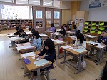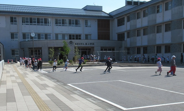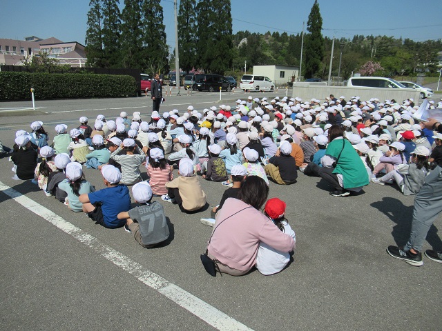 授業中の火災を想定した避難訓練でした。緊急放送で出火場所を聴き、「おはしも(おさない、はしらない、しゃべらない、もどらない)」を合い言葉に、屋外に避難しました。300人を超える全校児童が校舎から避難完了するまでの時間は約4分。口を閉じて、真剣に避難していたので、「今日の避難訓練は百点です!」校長先生から、満点をいただきました。