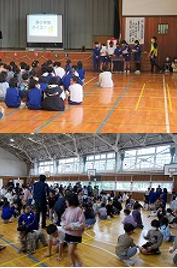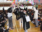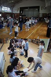 1年生を迎える会を行いました。2年生は、1年生にかわいい招待状を渡しました。3年生は、傘袋でロケットを作ってプレゼントしました。4年生は、校歌の歌と歌詞の書いた紙をプレゼントしました。5年生は、ふれあい班で協力して考えることができるクイズを出題しました。6年生は、手をつないで入退場したり会場を飾り付けたりしました。運営委員会が司会進行を行い、全校で遊ぶことができる動物進化ゲームもしました。