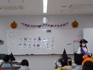 10月の月末の外国語活動を行う会議室は、ハロウィンの装飾がいっぱいです。ALTのラケエル先生も子どもたちも仮装して学習やじゃんけんゲームを楽しむことができました。