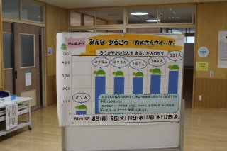11・12月の生活目標は,「廊下や階段は静かに歩こう」です。 先日は「みんなあるこう!かめさんウィーク」に取り組みました。始める前は廊下を走らずに歩いた人数は27人でしたが,取り組んだ後は331人に増えました。意識した結果が表れました。
