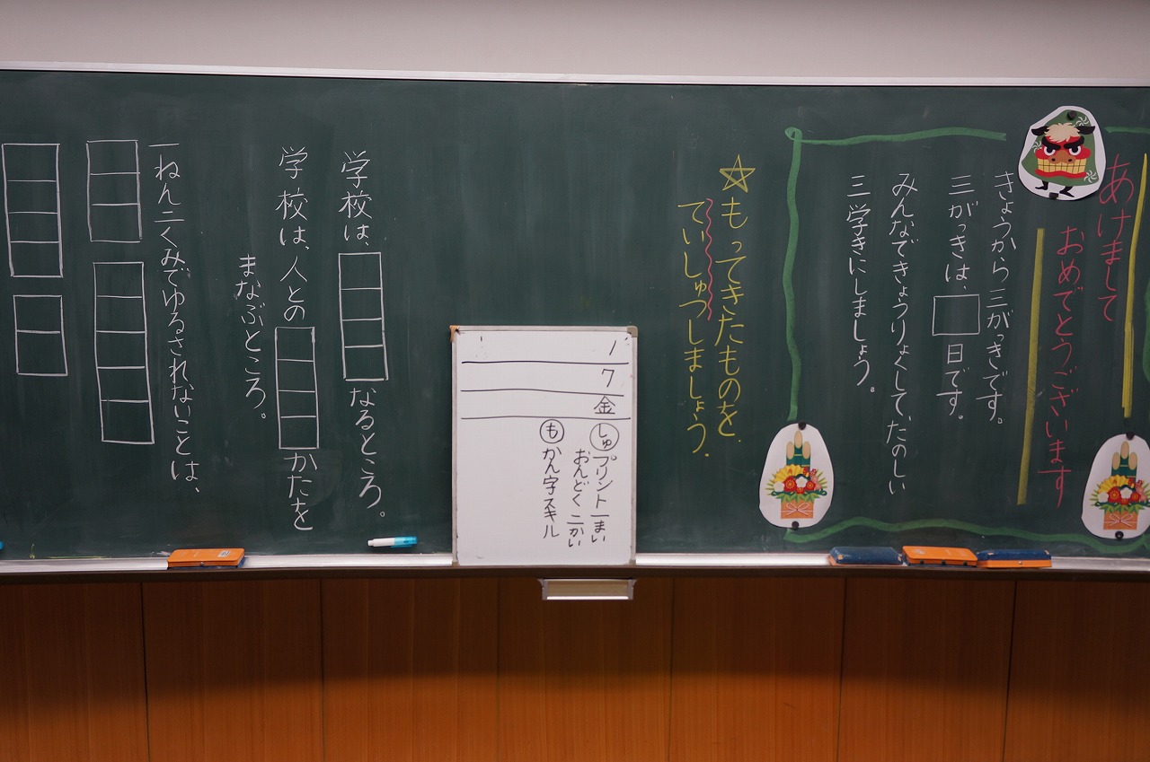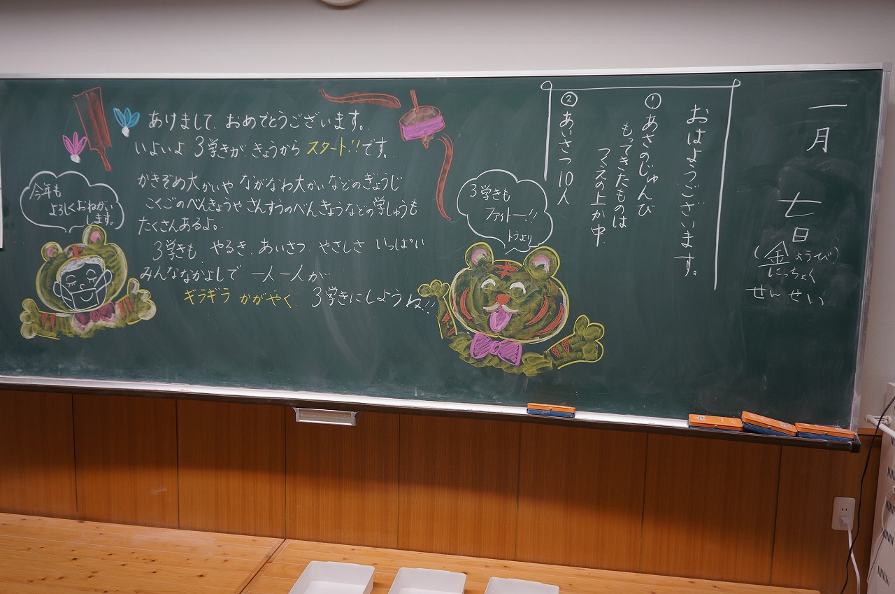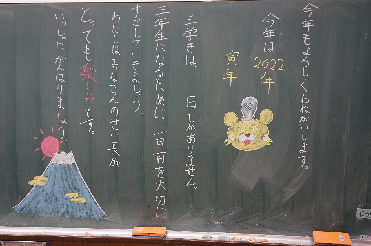 冬休みに十分エネルギーを蓄えた子どもたちが教室に戻ってきました。黒板には,子どもたちの意欲をかき立てるメッセージがかかれています。今年は寅年。「何事にも「トライ」していきましょう。」と,校長講話がありました。3学期52日間(1・2・3年生は51日間)のスタートです。